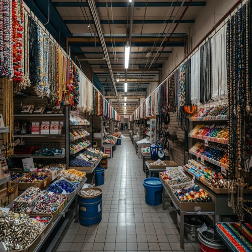 이우시장에서 비즈 관련 품목은 소재 기준으로 나뉩니다. 유리 비즈, 크리스털 비즈, 플라스틱 비즈, 진주 형태 비즈가 각각 다른 부스에 있어요. 여기다 펜던트, 체인, 연결링, 금속 장식, 마감 부속이 또 따로 구성돼 있습니다.